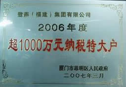 2007年3月9日,廈門市思明區在國際會展中心召開2006年度納稅大戶表彰大會,鷺燕(福建)集團喜獲“2006年度超1000萬元納稅特大戶”榮譽稱號。
